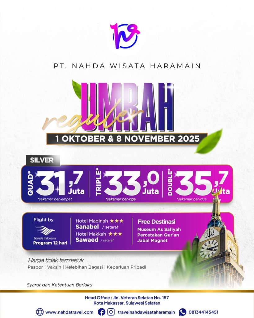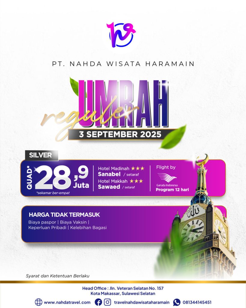 Paket umrah dibulan September 2025 bersama Nahda Travel menggunakan maskapai terbaik Indonesia dengan program perjalanan selama 12 hari.