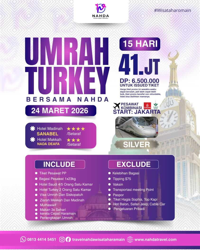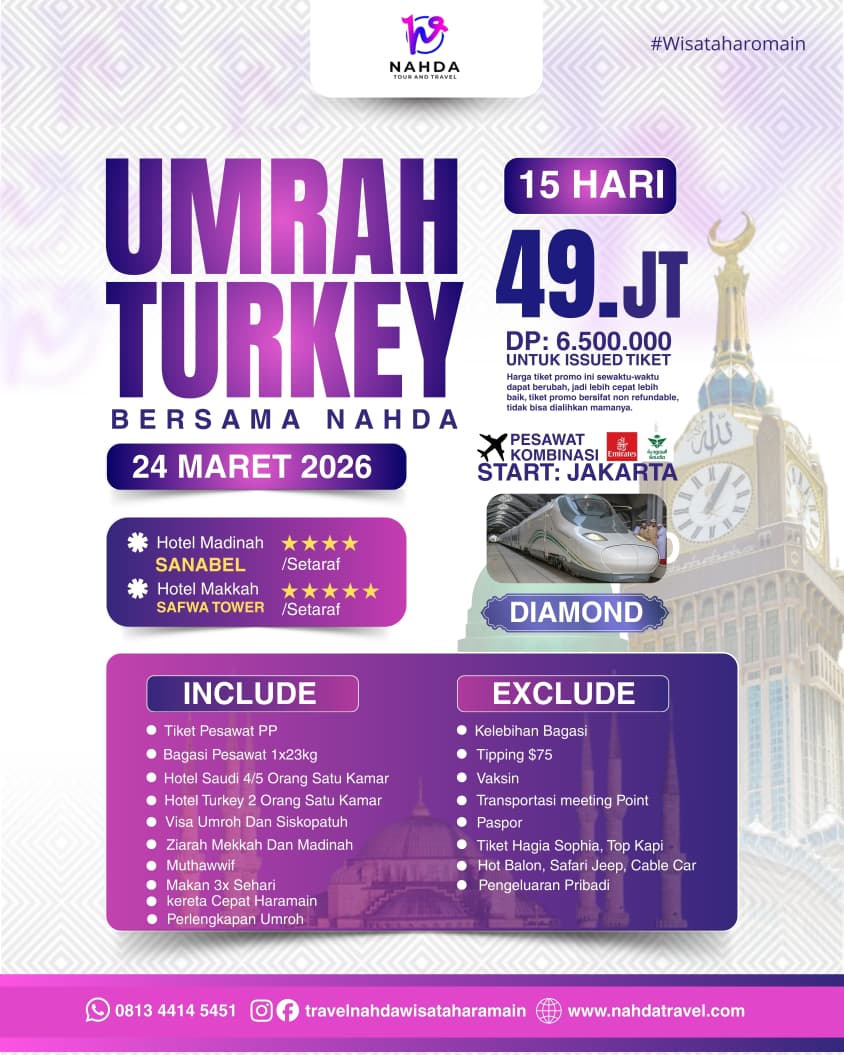 Rasakan keseruan trip di Turki dengan paket Umrah plus Turki 2026 bersama Nahda Travel. Paket denga program perjalanan selana 15 hari dengan fasilitas berbintang.