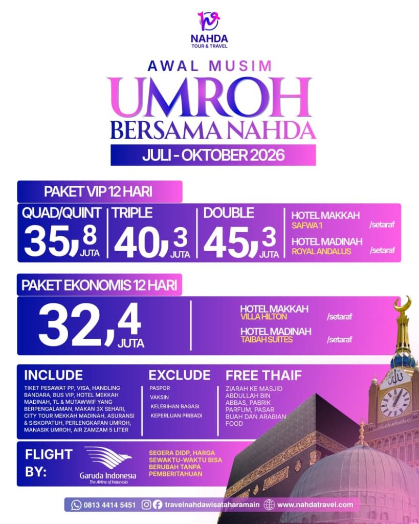 Paket umrah dibulan Juli – Oktober 2026 dengan banyak pilihan harga serta program perjalanan selama 12 hari bersama Nahda Travel.
